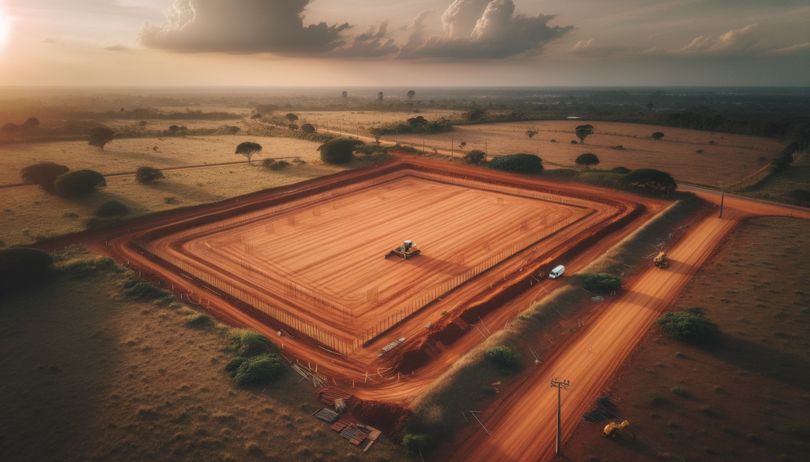 Limpeza, compactação do solo e demarcação topográfica do perímetro estrutural.